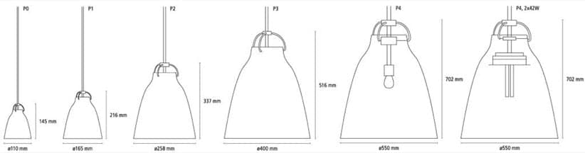 Hay cinco diámetros disponibles a elegir para esta lámpara colgante: 110, 165, 258, 400, y 550 milímetros. Del modelo más grande hay tres versiones, según el tipo de lámpara a utilizar (E27, 2x42w, y Dali). En relación a los colores, se puede elegir de entre tres opciones: