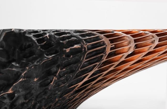 La mesa Metsidian es pura metamorfosis, es de otro mundo, y muchas otras cosas a la vez. Destaca por su composición material, su forma,… y su utilidad. Todas estas cualidades hacen que los límites entre mueble y escultura se fundan en algo que adquiere su propia identidad. Además revela una dinámica inquietante: la roca se transforma en una malla de metal brillante. Así es Metsidian, una original pieza exclusiva hecha con la combinación de vidrio volcánico (obsidiana) y cobre. Es toda una erupción que converge en un objeto nuevo, realizado tras explorar métodos alternativos de producción digital. El artista se llegó a preguntar: