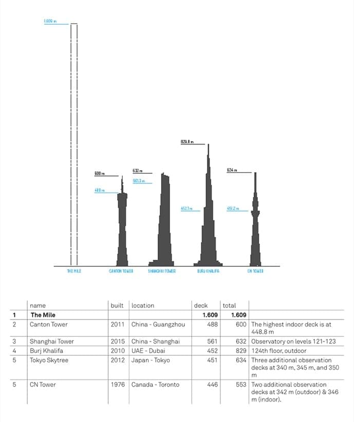 No sabemos muy bien si estamos ante un concepto que se quedaría en pura obra virtual, o ante un espectacular proyecto que se va a construir en alguna ciudad importante. En cualquier caso The Mile es una propuesta revolucionaria que se convertiría en la estructura más alta (1.609 m) jamás creada por el hombre. Duplica la del rascacielos Burj Khalifa, y se configura como un parque vertical. Arriba, en todo lo alto, hay una enorme plataforma de observación.