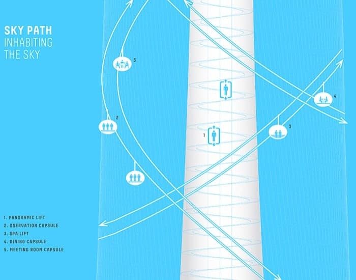 Pero una de las cualidades que más nos ha llamado la atención ha sido la variedad (y trazado) de las comunicaciones verticales. Hay una directa y rápida, que sería el grupo de ascensores panorámicos que circulan por su núcleo. Pero existen otros recorridos exteriores realizados con teleféricos, siendo más rápidos los que discurren próximos al eje del parque vertical, y más lentos los situados en la periferia (ver esquema). Para hacer aún más atractiva esta oferta, habría diferentes tipologías de cápsulas: de observación, acondicionadas como spa, como sala de reunión, en incluso para cenar.