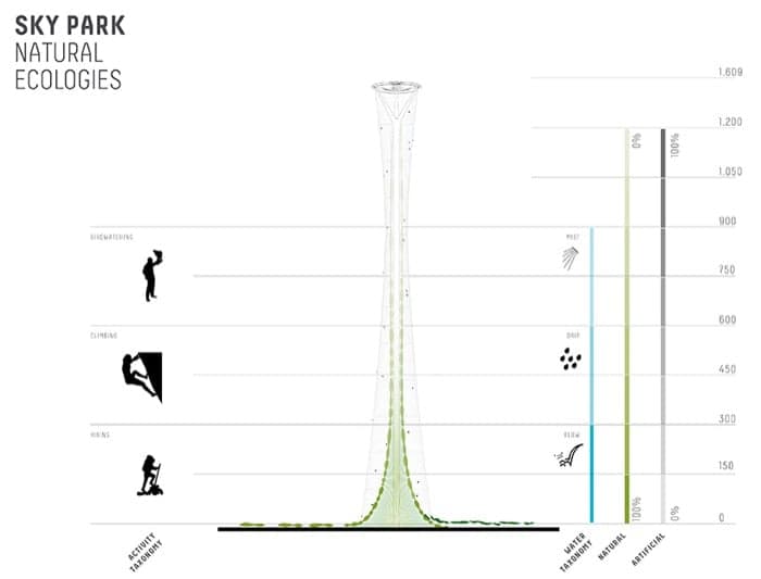 El mirador superior podría ser visitado por el público, que accedería a él realizando un recorrido por todo un ecosistema natural, de plantas y animales. Sus autores lo presentan como si fuera el Central Park de NY, solo que enrollado y colocado verticalmente (ver dibujos).