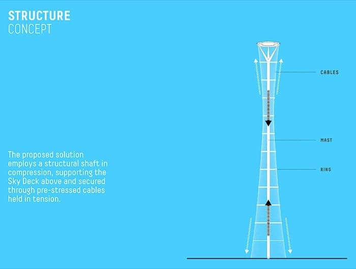 Para lograr la altura de una milla los ingenieros han pensado en una estructura muy ligera. Está formada por un eje de 20 metros de anchura, sometido a esfuerzos de compresión mediante una red de cables pretensados a su alrededor.