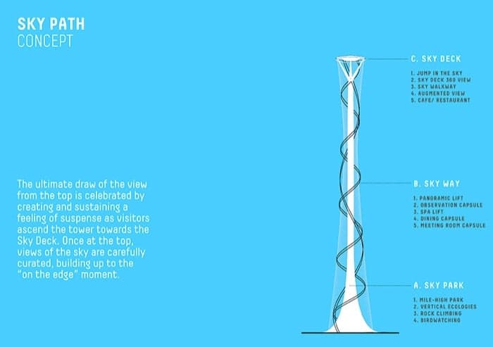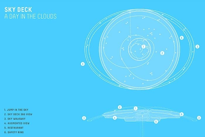 La plataforma superior (sky deck) no se limita a un mirador con vistas a 360º, sino que el diseño es más complejo. Comprende instalaciones de restaurante, un anillo exterior por el que pasear, una sala con imágenes de realidad aumentada superpuestas a las panorámicas reales, y piscina.