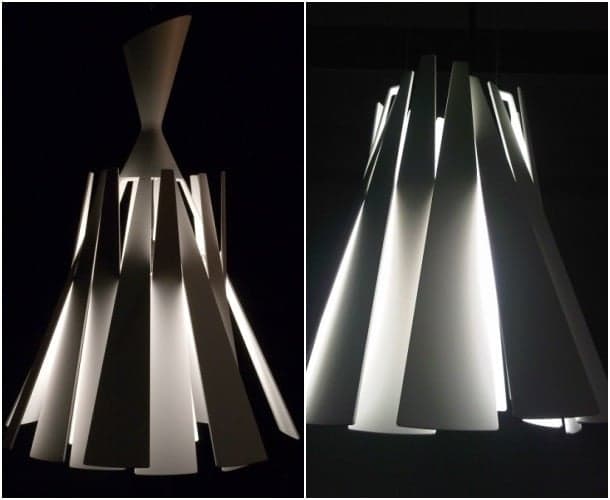 Las tiras que dan forma a estas lámparas están hechas de láminas de aluminio, y cada una de ellas se puede cambiar de orientación. La idea es que el usuario pueda controlar mejor cómo debe distribuirse la luz por el espacio. Esto provocará que no haya dos copias iguales, pues la pantalla de cada lámpara se verá distinta al resto. Aparte hay tres piezas que son fijas.