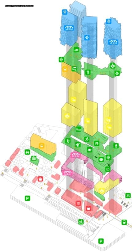 - En el lado oriental la densidad edificatoria es mucho mayor, con torres que tendrán un uso público en los niveles inferiores, para ir cambiando de forma gradual a usos más privados en sus pisos altos. Este área está configurada como una ciudad vertical por capas, creando diferentes espacios urbanos a diferentes alturas, y cada uno de una singularidad y funciones diferentes.