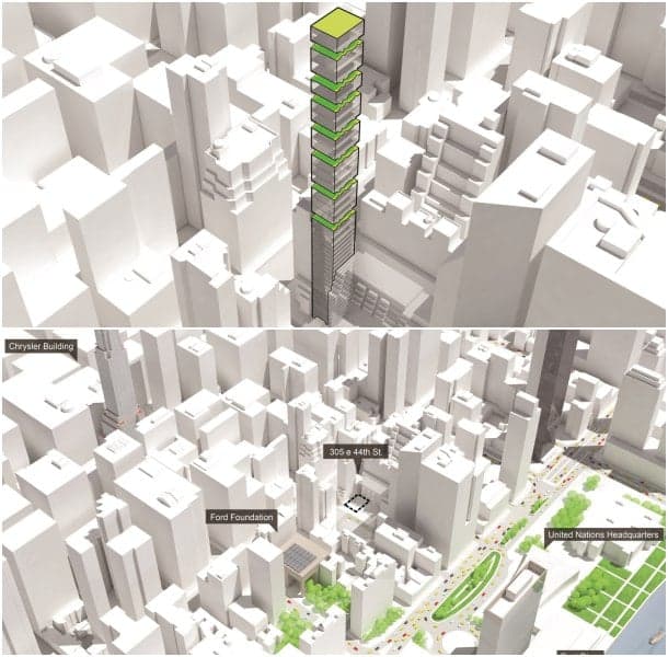 Esta arquitectura cumple con los parámetros propios de un rascacielos. Pero es también una esbelta estructura que proporciona ciertos aspectos de la vida urbana, desarrollados verticalmente. Todo eso sucede en esta torre de la calle 44 (305 East 44th), incorporando patios ajardinados cada determinado número de plantas.