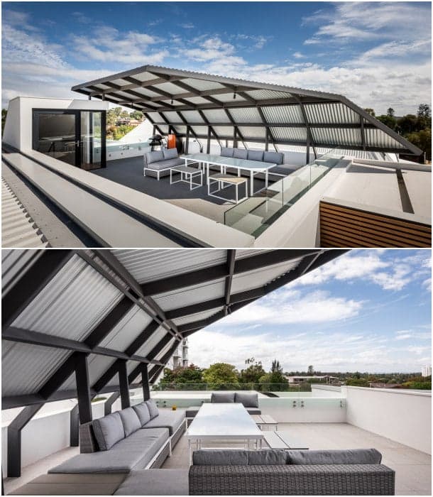 El arquitecto consiguió encajar el programa completo sin sacrificar el diseño. Logró mantener una altura suficiente de azotea para colocar un espacio de reunión al aire libre, protegido por una especie de marquesina metálica. Desde ahí se podía disfrutar de las vistas deseadas.
