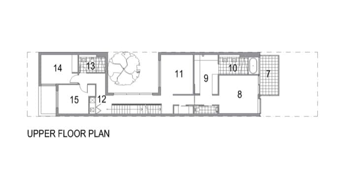 En la planta superior el patio aporta mucha luz natural a la escalera. También sirve de ventilación directa a la habitación de estudio. El dormitorio principal tiene vestidor, cuarto de baño, y un balcón hacia la fachada de entrada. Aquí se ha añadido una densa celosía de madera con un par de hojas plegables. Esto permite controlar la entrada de luz y la privacidad. Las otras dos habitaciones están en el lado opuesto, y comparten un cuarto de baño.
