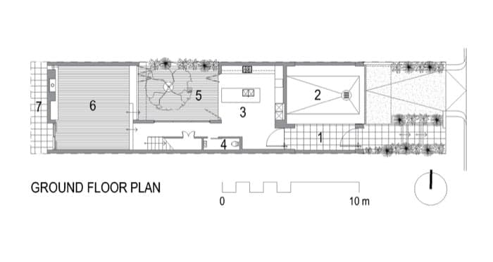 Para conseguir la correcta ventilación e iluminación de todas las estancias, se utilizó el recurso del patio interior. Así se conecta el salón con la cocina, creando en la planta baja un espacio muy singular. Los 6,7 metros de anchura del sitio permiten que la entrada peatonal no se solape con la del garaje. El parking es bastante peculiar, pues incluye un sistema de aparcamiento mecanizado. Así se consigue duplicar el espacio de garaje, al apilar dos vehículos. Como no hay sótano en esta moderna casa adosada, el hueco que queda bajo la escalera se ha utilizado para colocar un aseo.