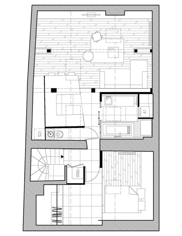 Estas fotografías corresponden a un proyecto de renovación (Habiter sous les tuits) en la última planta de un antiguo edificio de París. El objetivo era conseguir un pequeño apartamento bajo cubierta, que tuviera la máxima superficie útil y luz natural posible.