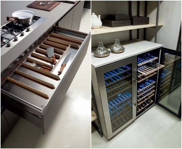 Materika tiene una encimera muy especial, que facilita las relaciones familiares alrededor de una isla de cocina. Y es que sus islas están diseñadas para poder integrar diferentes zonas, algo habitual en muchos hogares. La colección también incluye muchos accesorios de todo tipo. Hay cubos para reciclado de residuos que encajan perfectamente dentro de los cajones. También hay compartimentos para guardar de manera ordenada la vajilla y la cubertería. Incluso nos ha llamado mucho la atención el mueble bodega, o la moderna versión de armario vitrina con puertas de vidrio.