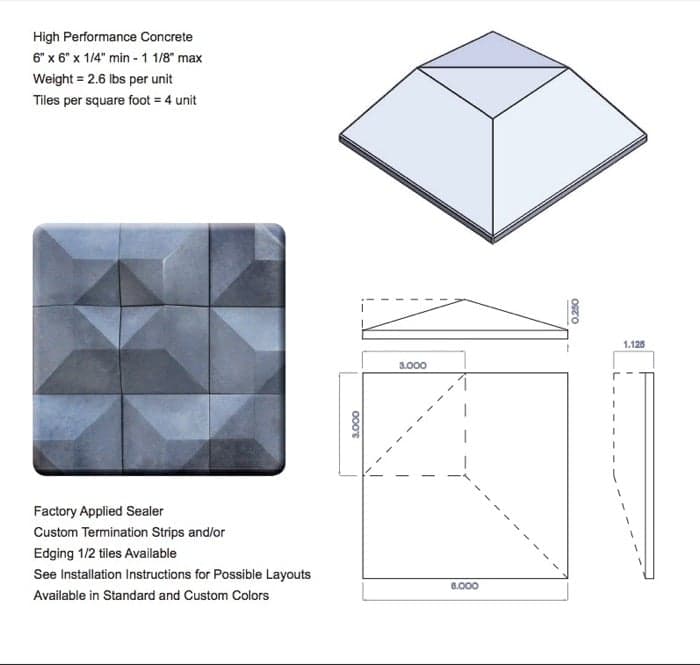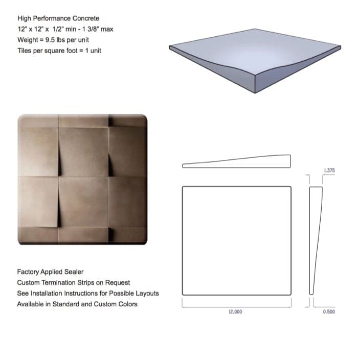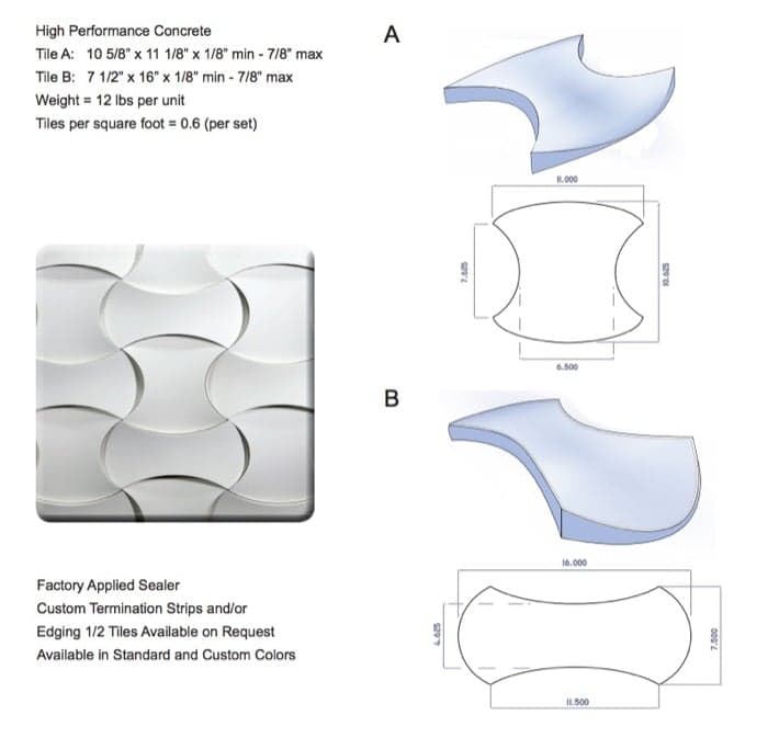 Cada una de estas piezas se fabrica con un hormigón ligero que contiene un 38% de material reciclado. Su acabado es suave y pulido. El tamaño y espesor varían en cada diseño. Adjuntamos imágenes con las dimensiones (en pulgadas) de los diseños que nos parecieron más interesantes.