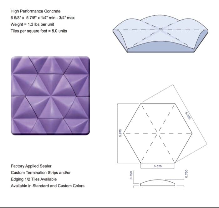 El azulejo tridimensional Dimensions es un producto de la compañía DEX Industries. Se dedica a fabricar materiales de revestimiento de hormigón y terrazo, pero con propiedades sostenibles, y siguiendo prácticas respetuosas con el medio ambiente.