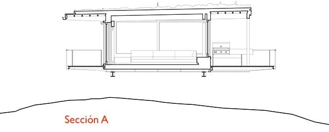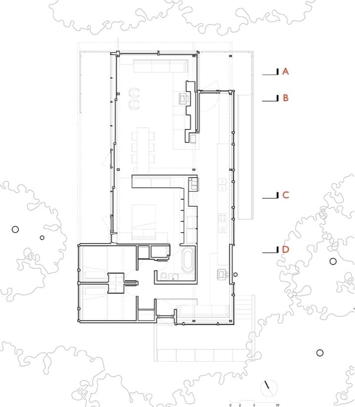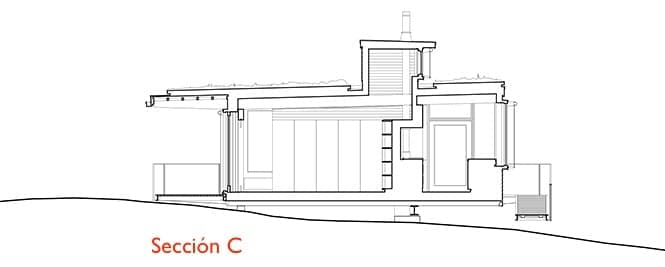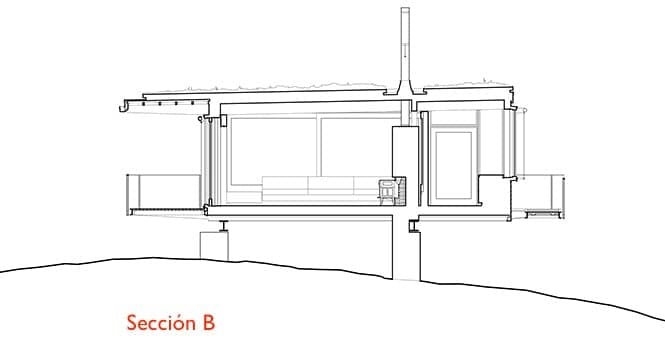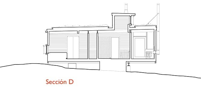 Toda la fachada de vidrio del oeste tiene delante una terraza, que permite el acceso hacia el exterior desde la sala-comedor, y el dormitorio principal. Otro detalle interesante de esta encantadora cabaña de vacaciones es que permite la entrada de luz cenital sobre el baño y la habitación principal. Esto se puede ver en los planos de sección C y D.