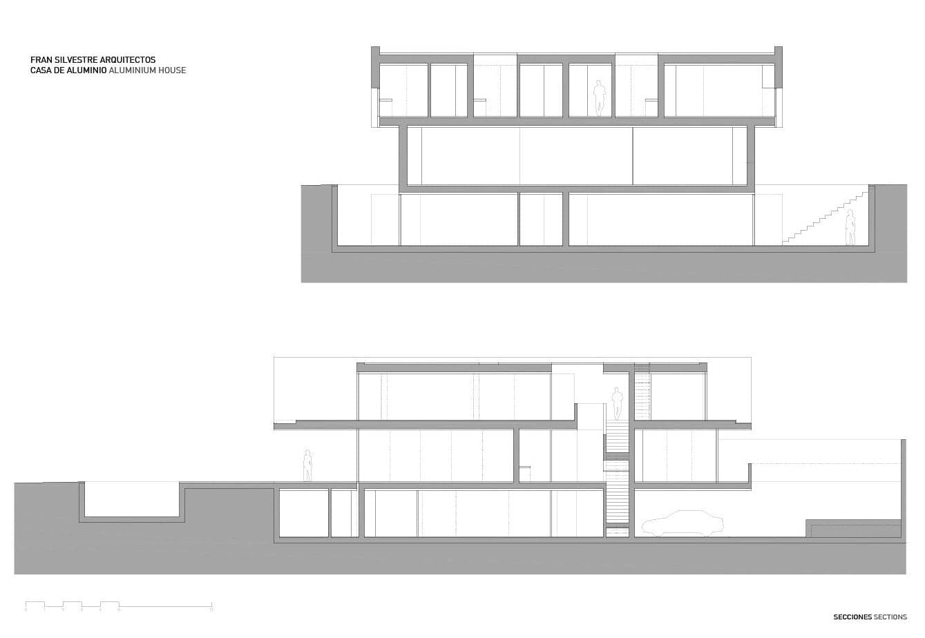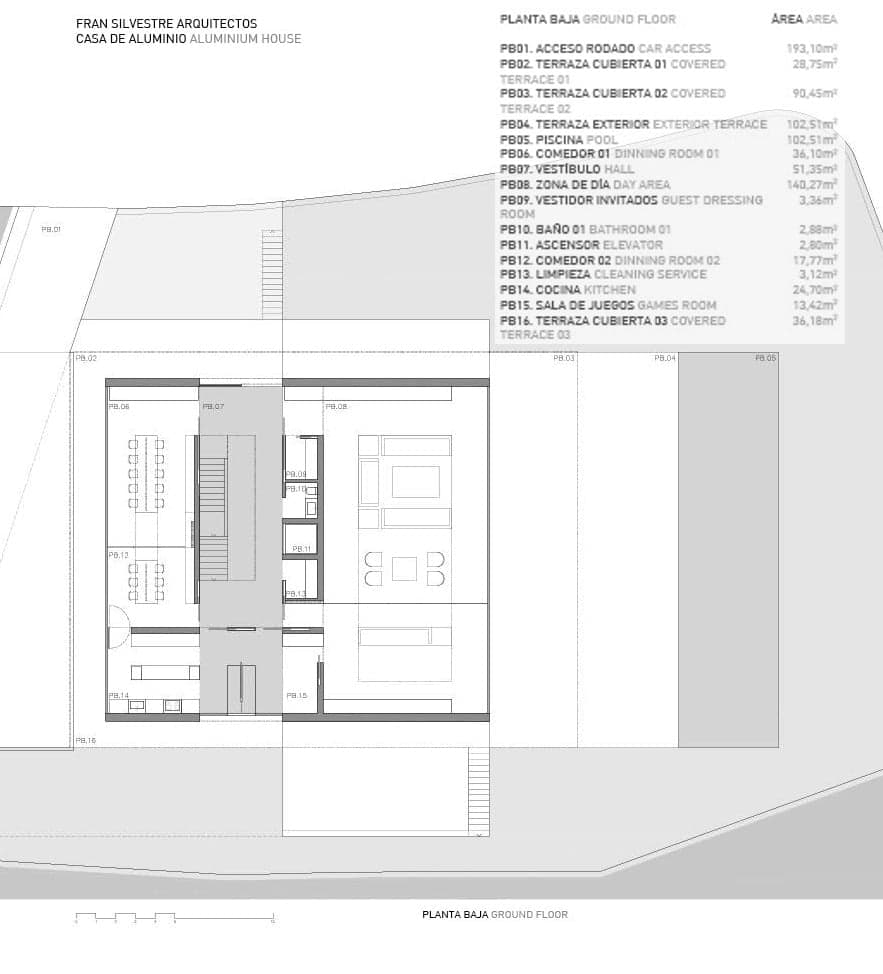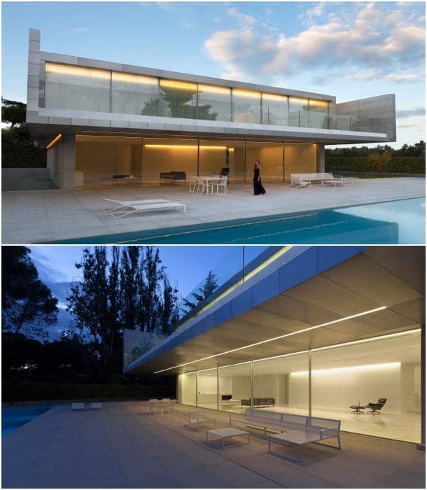 Hay que admitirlo. Cuando una obra arquitectónica se presenta con un buen trabajo gráfico, el proyecto se ve de mejor calidad. La siguiente foto es impresionante. Está realizada cuando entra la noche, para exhibir a la Aluminum House en todo su esplendor. Es un proyecto de vivienda minimalista, desarrollado por Fran Silvestre, en una finca madrileña rodeada de grandes árboles.