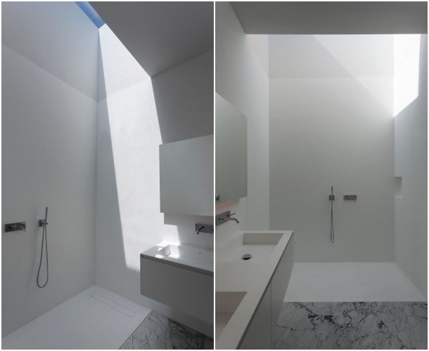Al ser interiores los cuartos de baño de los tres dormitorios, se ha introducido una línea de luz natural cenital, que pasa justo encima de las duchas. Este efecto queda realmente bien, y se repite en el vestidor del dormitorio principal.