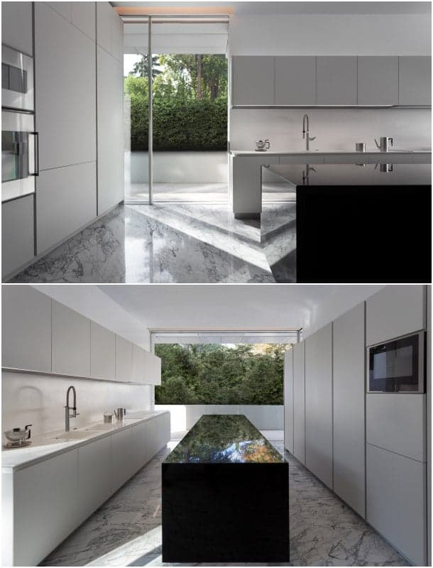 Como ya se ha mencionado más arriba, estamos ante una vivienda minimalista. Se ajusta a lo que ya hemos visto en otras ocasiones de este arquitecto. Aquí se ha querido que en la decoración interior predomine el blanco. El negro es el único contraste permitido. En el exterior predomina el aplacado de piedra de la planta baja, y el revestimiento de paneles de aluminio en el piso superior. Salvo en el sótano, los suelos son de mármol blanco con vetas negras.
