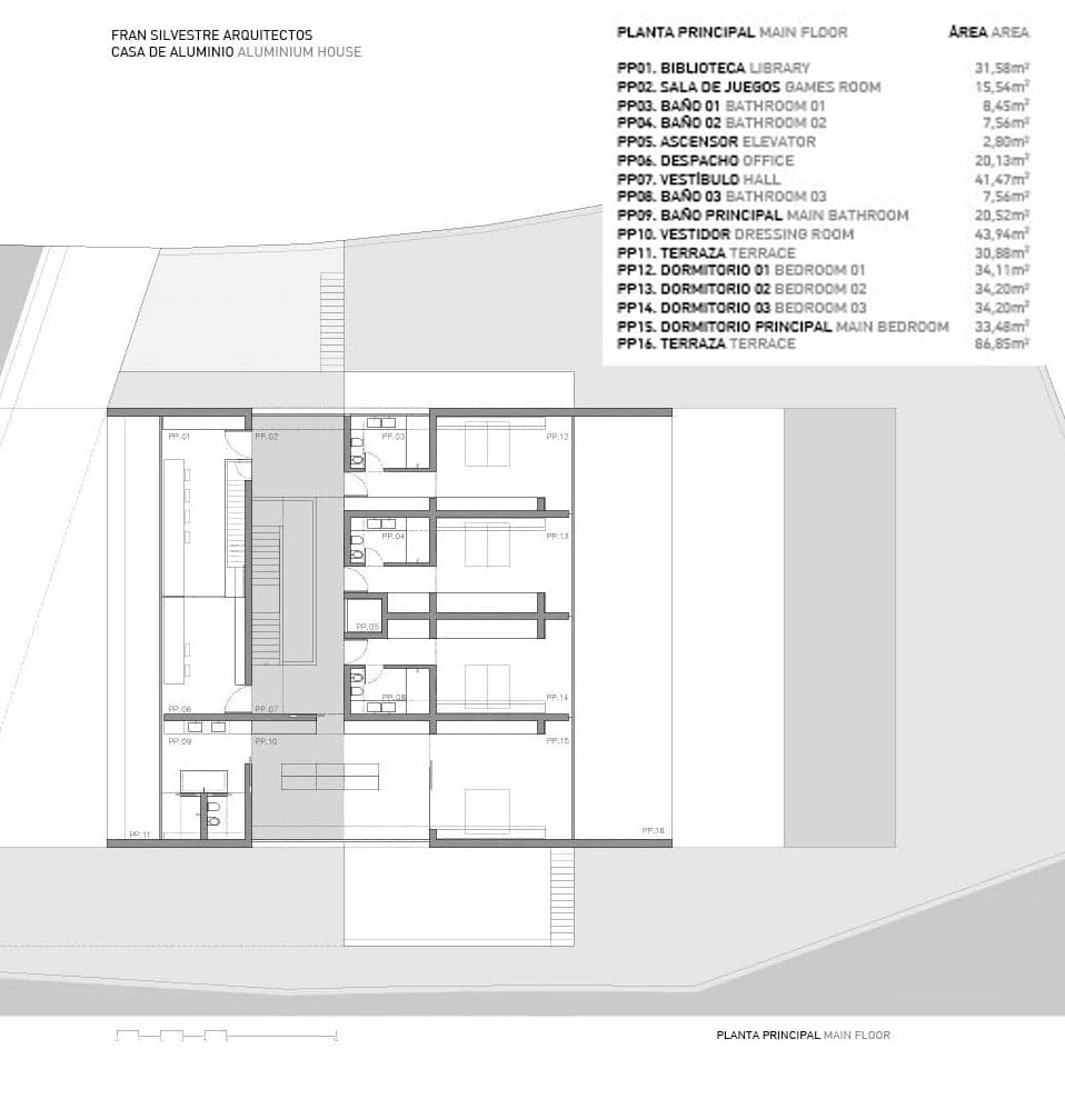 Una pieza [la casa] de naturaleza metálica, horizontal, produciendo el efecto de tener una sola planta. […] La escala de la casa se modera gracias a entender la zona de día como un zócalo que emerge con la misma piedra natural que urbaniza parte de la parcela.»