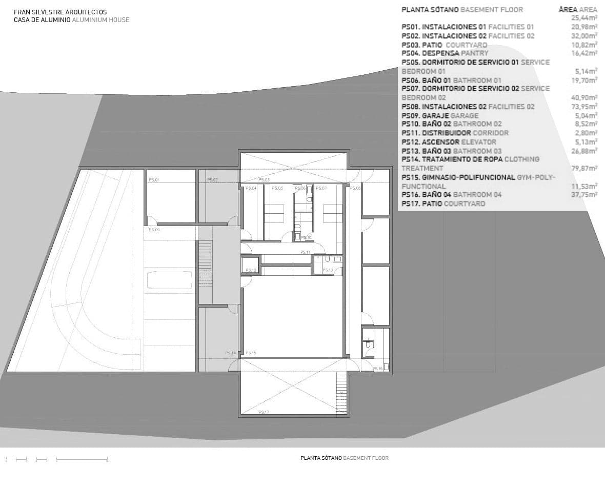 Este nivel no solo se ha utilizado para colocar un garaje para 5 vehículos. También se han puesto aquí los cuartos de instalaciones, para el tratamiento de ropa, y despensa. Las habitaciones para el servicio doméstico ventilan a un patio lateral, mientras que en el lado opuesto hay otro más grande, con escalera exterior. Este patio aporta luz natural a una sala multifuncional con cocina empotrada y cuarto de baño. Se puede utilizar tanto como gimnasio, o como espacio para fiestas de cumpleaños, etc.