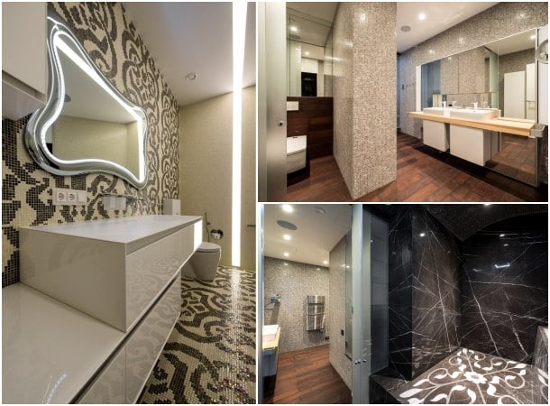 Sus autores prefirieren referirse al estilo de este apartamento como algo más cercano al futurismo decorativo. Nosotros no lo vemos así. Es cierto que en el mueble-armario del salón y en uno de los dormitorios, sí existen detalles más modernos, pero en el resto no ocurre igual. El trabajo realizado con los mosaicos y mármoles de los cuartos de baño, está en las antípodas de todo lo anterior. Además, utilizar cortinas que arrastran para controlar la privacidad, tampoco es muy del siglo22.