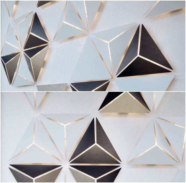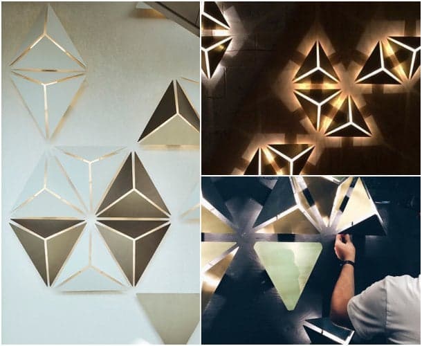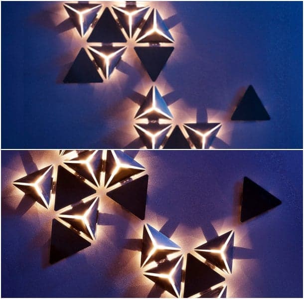 Cada unidad tiene forma de pirámide, compuesta por tres paneles triangulares. Pero LightGarden en vez de jugar con transparencias, lo hace con proyecciones. Por eso los paneles son opacos, y por ese motivo no se tocan entre sí, ni tampoco entran en contacto con la pared. Dejan que la luz se escape por sus bordes, y entonces sucede la magia. Este sencillo detalle hace que la lámpara aporte valor a la superficie de la pared, potenciando su textura.