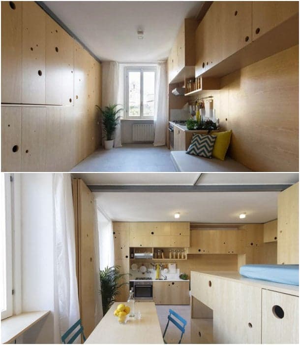 Este sistema de partición plegable hace que el apartamento gane en flexibilidad en cualquier momento del día. Cuando la pared se extiende, es posible ocultar una parte del espacio, ya que al no haber una puerta convencional, es como si no hubiera nada más al otro lado de la madera.
