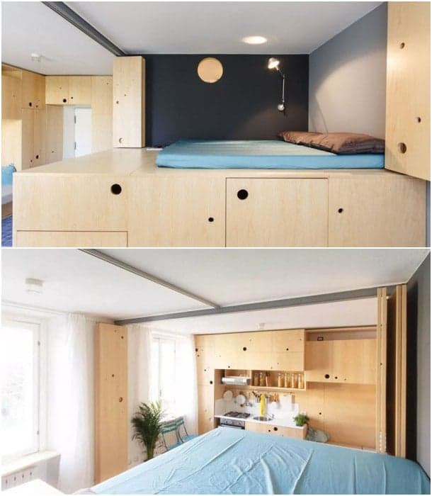 La altura libre era de 2,7m, y uniforme en toda la superficie. Esto impedía la posibilidad de duplicar el aprovechamiento del espacio, como ya habíamos visto en otros ejemplos. Es decir, era imposible colocar un altillo para dormir, justo encima del cuarto de baño o cocina. Pero en lugar de poner la cama encima de un espacio habitable, se puso sobre un espacio de almacenamiento.