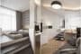 Este trabajo de interiorismo consistió en mejorar la organización y decoración de un pequeño piso. La idea era convertirlo en un apartamento de lujo. Pero debido a las limitaciones de espacio, la sala más grande tuvo que utilizarse también como dormitorio, por eso aparece una cama elevada.