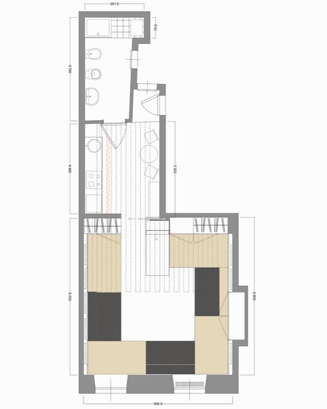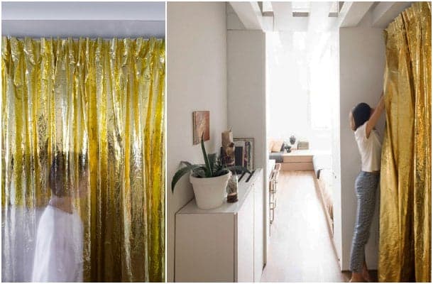 Viendo el plano de planta, no había demasiadas posibilidades para elegir la ubicación de las funciones. El espacio más grande tiene unas dimensiones de 5,03 x 5,33m (26,81m2), y posee las dos ventanas principales del apartamento. En el lado opuesto, hay una ventana en la entrada, y otra más en el baño. El espacio intermedio se ocupó con la cocina, la cual puede ocultarse con una cortina, hecha con una manta isotérmica recuperada.