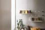 Las paredes de este espacio están en consonancia con el resto del hogar, son blancas. Los paneles laminados sirvieron para ocultar alguna instalación de la casa. También con ellos se tapó parte de la iluminación. Un ejemplo de ello son los que están perforados, y sirven para la colocación de los estantes, que tienen unos tubos de neón escondidos detrás. Sirvieron también para organizar armarios, y para crear una elegante mesa abatible.
