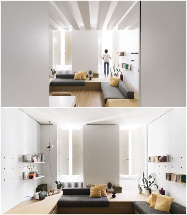 Seguramente habrá llamado la atención que las ventanas hayan quedado un tanto inaccesibles. Eso es porque el mobiliario de la sala está diseñado para utilizarse descalzo, y subirse en él.