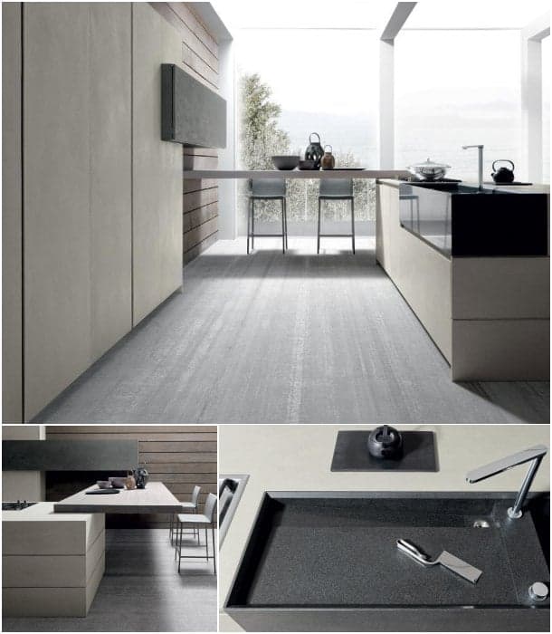 Antes de continuar, hay que aclarar que aquí el cemento no se ha utilizado como elemento estructural de estos muebles. Solamente se emplea para darle el acabado final a ciertos elementos de la cocina. Utilizando una tecnología extraordinaria, las puertas y cajones de estos armarios están recubiertos con una capa de apenas 3mm de resina de cemento. Cuando esa resina se ha secado, la superficie queda suave, resistente, y de un tacto frío.