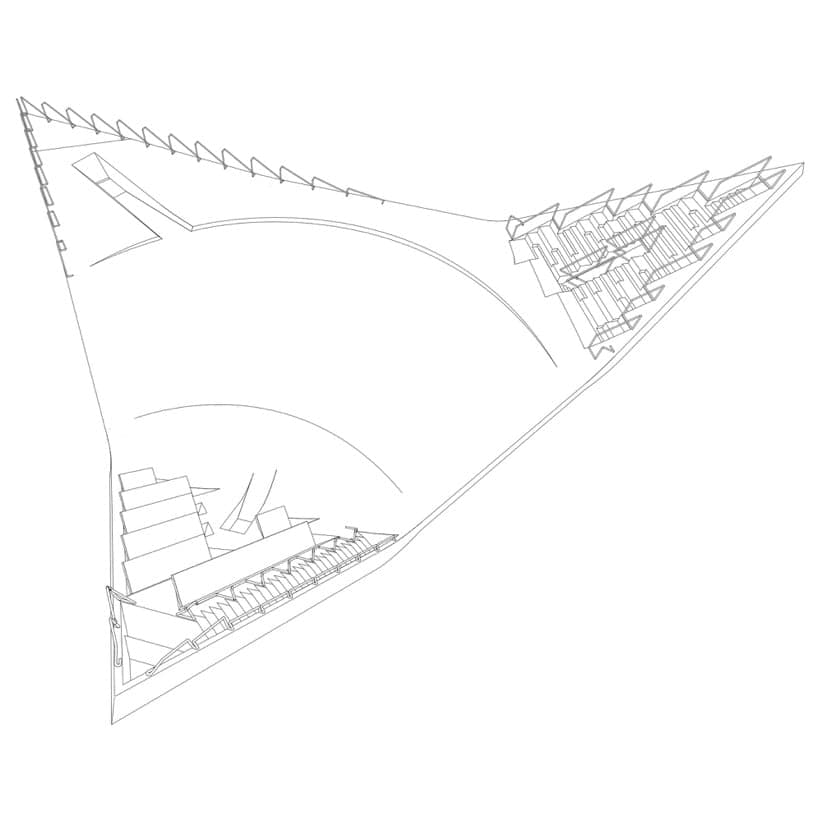 Se utilizó un gran losa de hormigón, de 80cm de canto, que tiene forma triangular. Esta geometría sirvió para distribuir con claridad los elementos principales del mirador. Cada esquina está en voladizo, y ofrece puntos de vista diferentes al visitante. Una de ellas es horizontal, mientras que las otras dos están levantadas, con mucha inclinación. La que apunta al norte es el mirador principal; la del sur funciona como una especie de grada; mientras que la del oeste sirve de alojamiento a los paneles solares que alimentan de energía estas instalaciones. Justo debajo están los aseos.