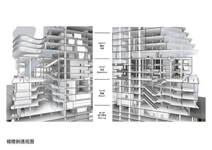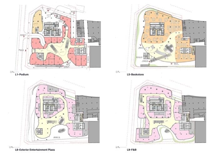 En el volumen que forma la base de la torre, también se han incluido unos niveles dedicados al entretenimiento. Esta zona presenta un trazado curvilíneo, y posee terrazas ajardinadas. Justo encima y debajo de la gran tienda de libros, se han organizado grandes espacios públicos, a modo de plazas. Esto hace que cada uso quede bien diferenciado desde el exterior.
