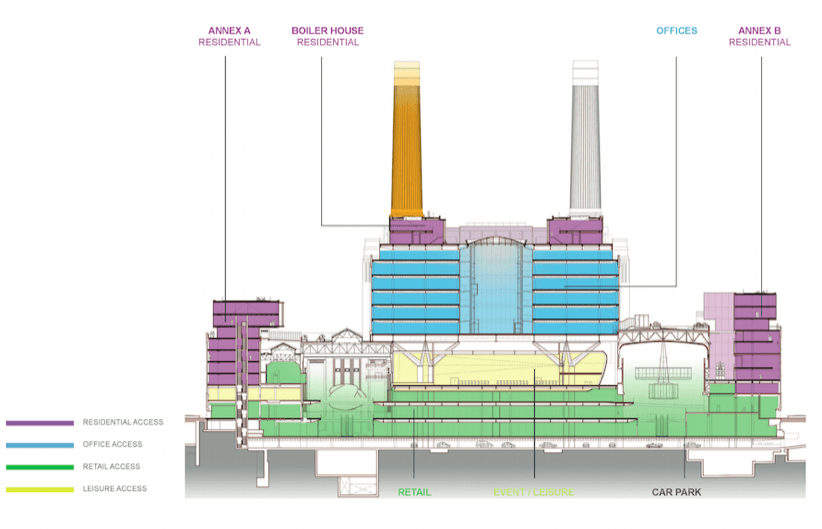 La rehabilitación de Battersea forma parte de un plan urbanístico que ordena todo ese sector de la ciudad, a completar en 7 fases. Ello supone una inversión de 16.500 millones de dólares para construir nuevos edificios con viviendas de lujo, oficinas, hoteles, espacios públicos ajardinados, y azoteas verdes.