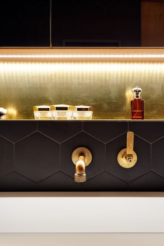 La grifería de latón añade otro toque atrevido. No estamos ante ningún diseño carísimo, simplemente es diferente a lo habitual. Para el espejo se creó en la pared una sencilla hornacina, con un acabado dorado. Este gesto sirvió para establecer un importante diálogo con los grifos. No hay que perderse la luz perimetral que se añadido al espejo.