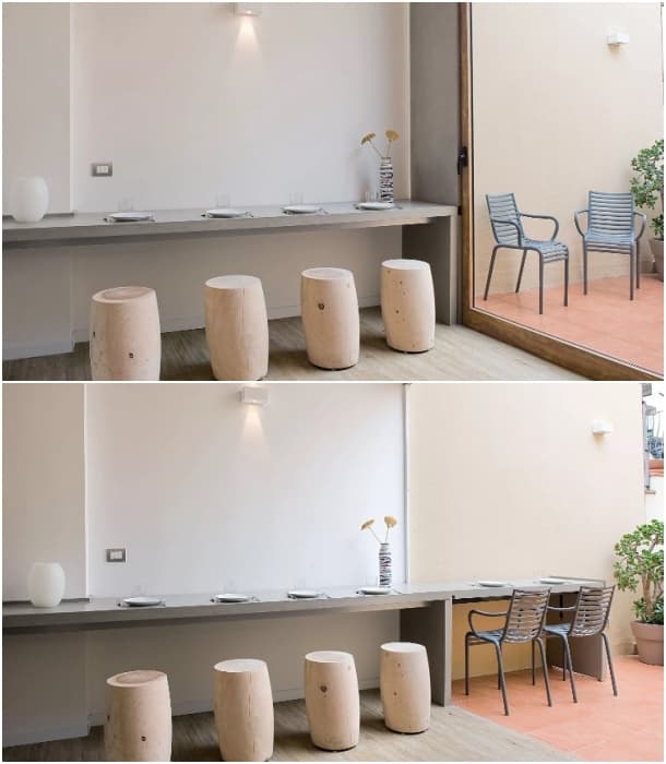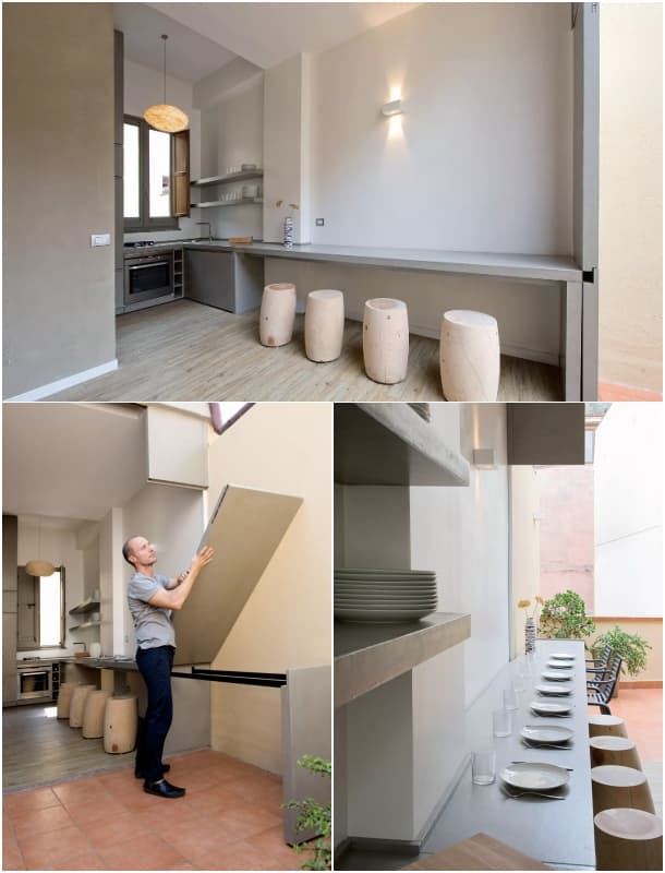 Aquí la mesa para comer es una continuación de la encimera de la cocina. No solo desaparece la mesa de comedor, es que además el tablero habilitado para ello ni siquiera tiene 60cm de ancho. Esta implementación fue incluso más radical, porque en caso de haber invitados (y en época de buen tiempo, se entiende), dicho tablero se extiende hasta la terraza.
