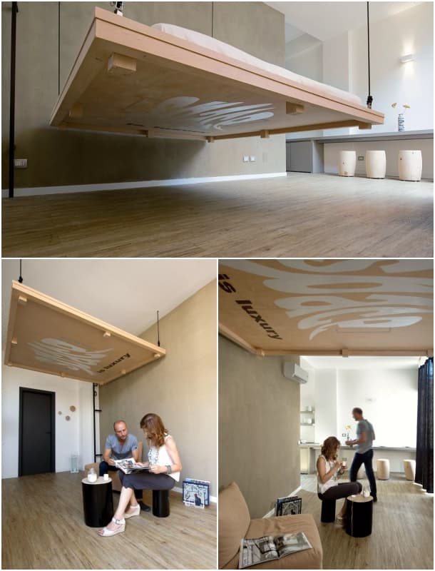 Bueno, hay que admitir que esta solución no es nueva. Ya han pasado por nuestro blog varios modelos de cama que se eleva. Aquí la cama es un gran tablero de madera (más grande que el colchón), que está perfectamente enmarcado. Posee un total de 8 apoyos (tacos de madera), repartidos por su perímetro, pero todo el conjunto queda suspendido de las esquinas por unas cuerdas. Un sistema cabrestante eléctrico hace que la cama desaparezca, elevándose hasta el techo.