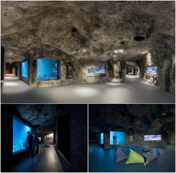El siguiente tramo discurre por unas cuevas, que describen el hábitat subterráneo de ciertas especies endémicas. Aquí hay salas más espaciosas, con iluminación procedente de los acuarios, y grandes cojines para que la gente se acomode.