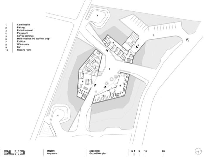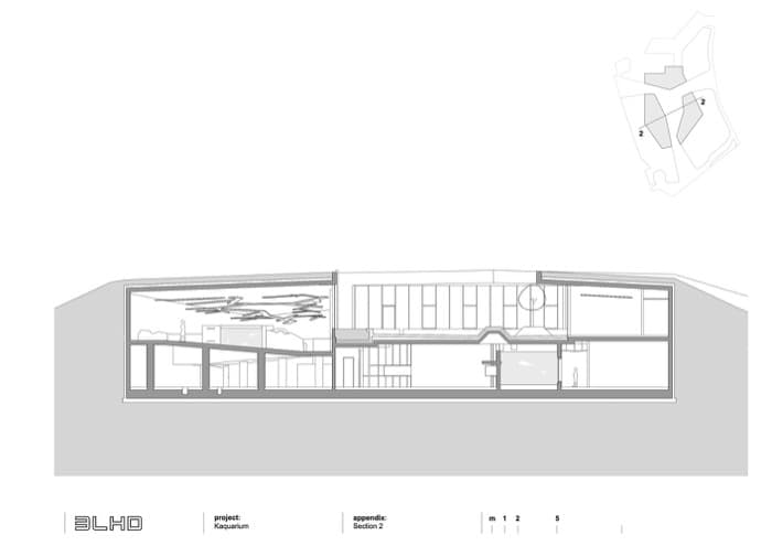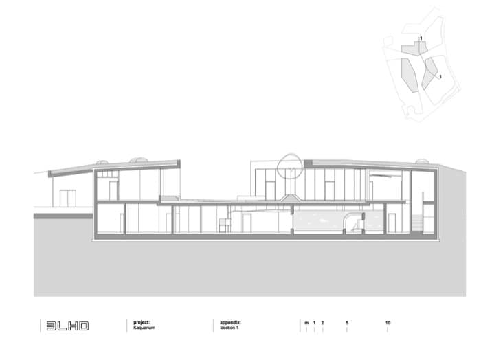 Estas fotos y planos son del Acuario de agua dulce y Museo del Río construido en Karlovac (Croacia). Los arquitectos respondieron con una arquitectura camuflada en el paisaje. El gran atractivo arquitectónico de este proyecto está precisamente en que «se niega» como edificio.