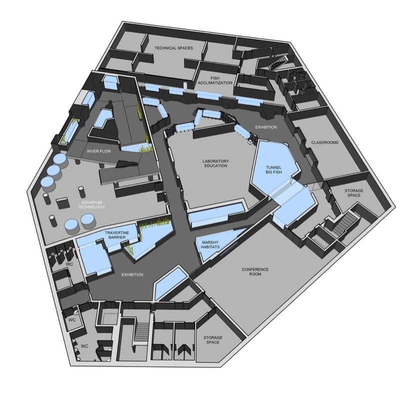 Este acuario está ubicado junto al río Korana. Su diseño se inspira en el centro histórico de la ciudad de Karlovac: rodeado de muros defensivos con forma de estrella. La idea era crear un atractivo turístico al otro lado del río.