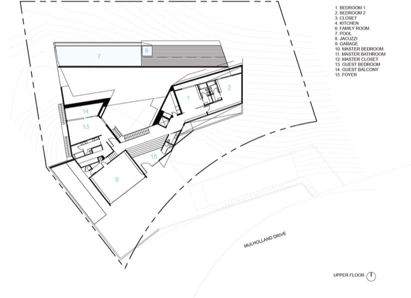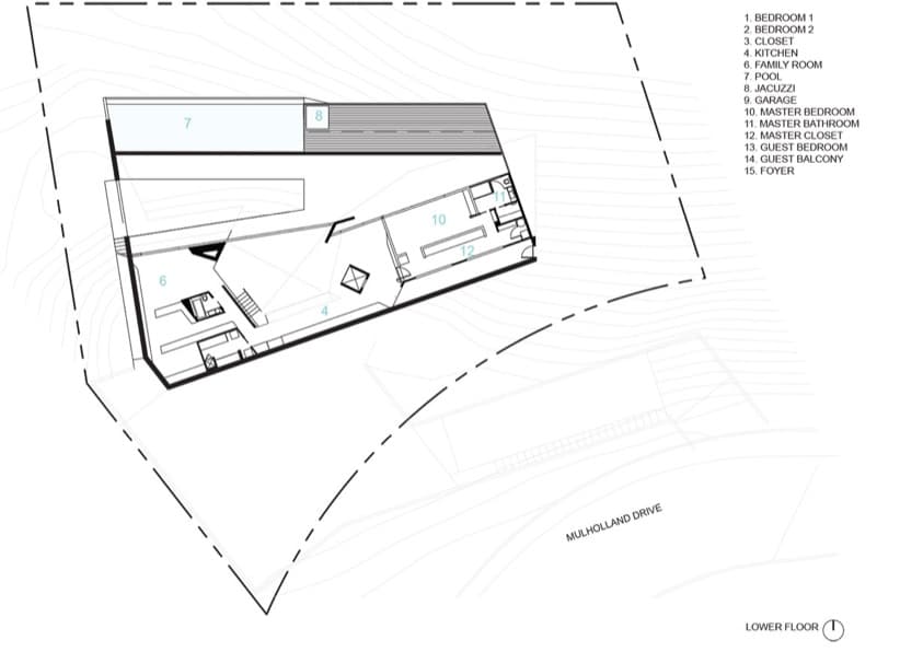 Mulholland Drive es una famosa calle-carretera que recorre la cresta de las colinas de Santa Mónica, y Hollywood. Es famosa por sus espectaculares vistas sobre la ciudad de Los Ángeles y San Fernando Valley. Desde una de sus curvas se tiene acceso a esta moderna vivienda. Es un edificio que disfruta de una buena panorámica sobre North Hollywood.