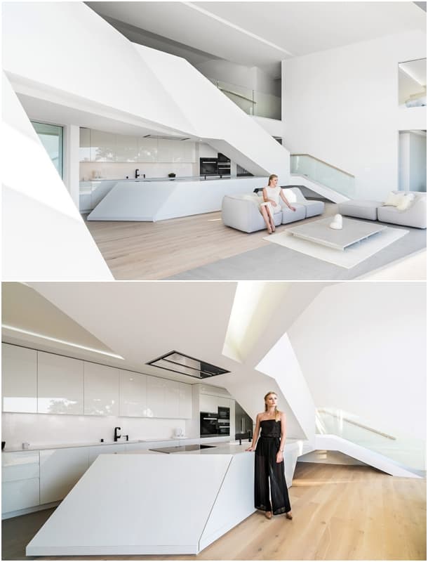 El interior es una continuación del mismo lenguaje exterior. La superficie inclinada aparece cuando menos te lo esperas, casi tropiezas con ella. Y el blanco también lo invade todo. El reflejo del vidrio también se encuentra en los muebles de la cocina. Un suelo de roble blanco ayuda a hacer más confortables estos espacios llenos de luz.