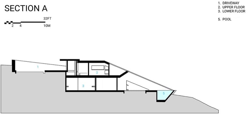 Sus 464m2 están repartidos en dos plantas principales, que se organizan a lo largo de un eje este-oeste. Las restricciones de los reglamentos de planificación impusieron grandes desafíos, que empujaron a colocar el edificio más abajo de la empinada cuesta. Además hay que tener en cuenta que las restricciones de altura y vista, obligaron a un perfil más estrecho, sobre todo en la fachada de acceso.