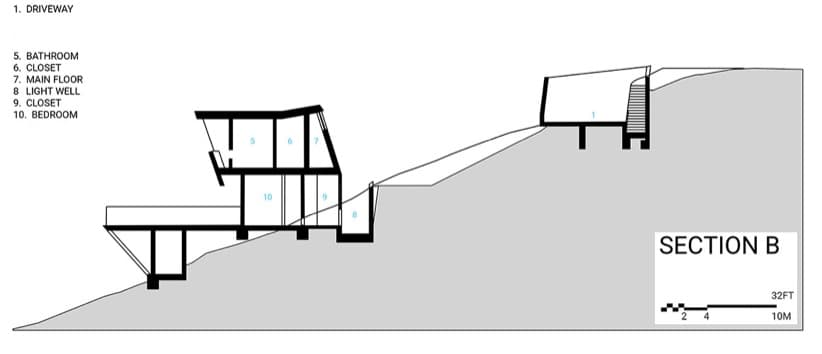 En la parte más alta de la casa se encuentra el garaje. A él se llega desde una rampa que tiene una escalera paralela. El nivel superior cuenta con 2 dormitorios que dan a una estrecha terraza, y una habitación para invitados. Estas habitaciones disponen de cuarto de baño propio. En la planta inferior está la suite principal, la sala de estar con la cocina, el comedor, y una habitación familiar con escritorio y muchos estantes.