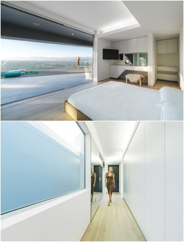 Todas las estancias del piso inferior tienen acceso a una terraza con piscina y jacuzzi. Hay grandes huecos con puertas correderas, y un ventanal en la parte superior del espacio a doble altura que define la sala. Esto permite que desde la entrada de la casa (piso superior) se pueda ver el valle.