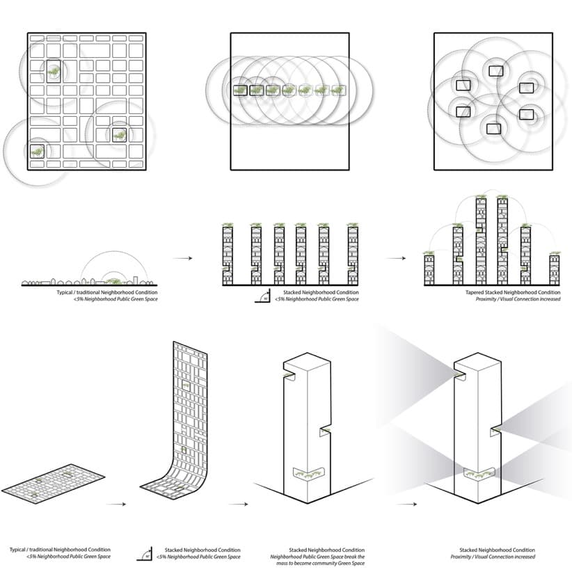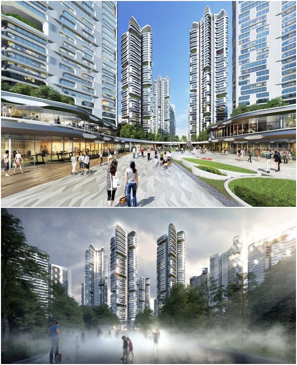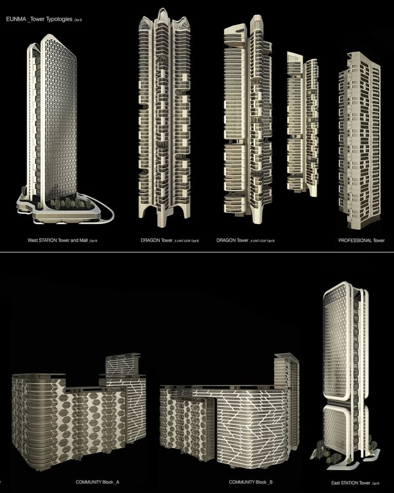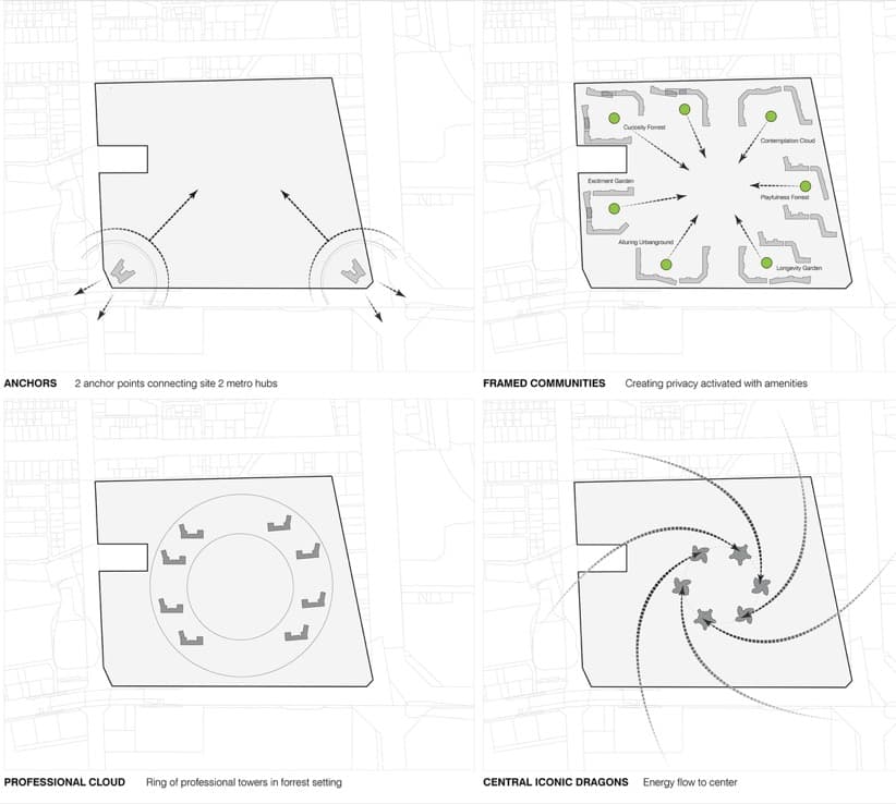 El centro del plan está ocupado por 6 torres de 50 pisos, el resto son bloques de menor altura. Esto mejora considerablemente la conexión visual con su entorno. Además, una planta baja multinivel une las torres centrales, aportando integridad al proyecto.