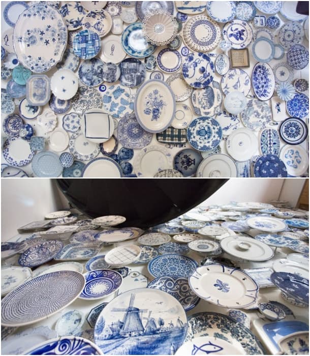 Para conseguir esa decoración en tres dimensiones, se anclaron a la pared soportes metálicos de diferentes longitudes. Finalmente se colgaron los platos, distribuyéndolos de manera aleatoria. Así fue como los 300 platos cerámicos, procedentes de todos los rincones del mundo, sirvieron para decorar la pared.