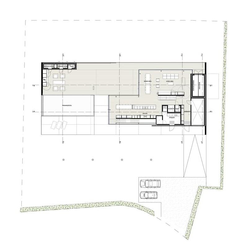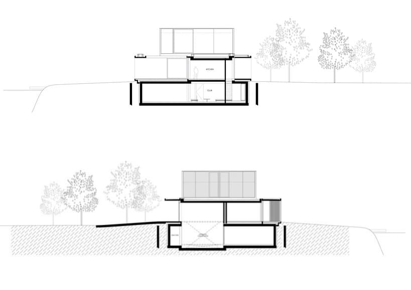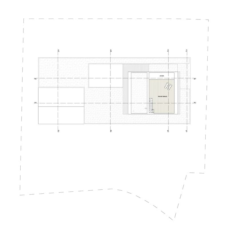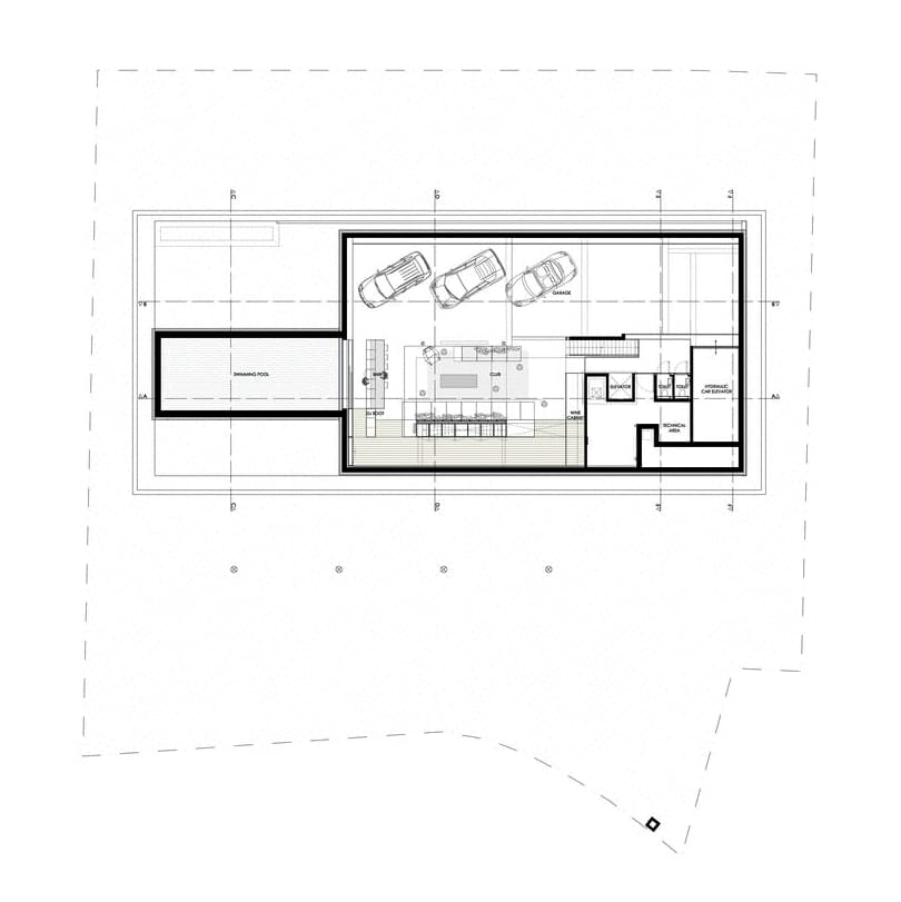 Se trata de una casa de dos plantas, y se ubica en la parcela según un gran rectángulo, que incluye la piscina y toda la terraza exterior. Pero también dispone de un sótano, el cual está tratado de una manera muy peculiar. Es un proyecto en el que predomina la horizontalidad. Esto viene motivado porque la losa que define el techo de la planta baja, se prolonga para cubrir un espacio anexo a la piscina.