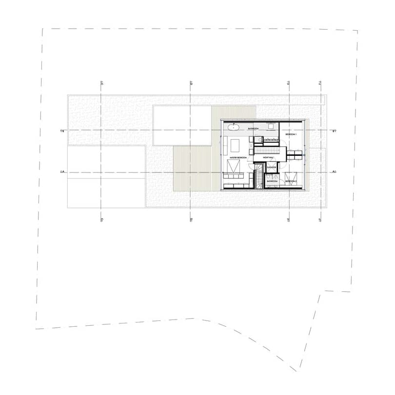 En un volumen de planta cuadrada están los tres únicos dormitorios que tiene esta lujosa casa. Si observamos el plano de planta alta, veremos que hacia el río y la calle las fachadas son opacas. Pues bien, con vistas a la piscina está el dormitorio principal, y hacia la fachada opuesta se han dispuesto otros dos dormitorios.